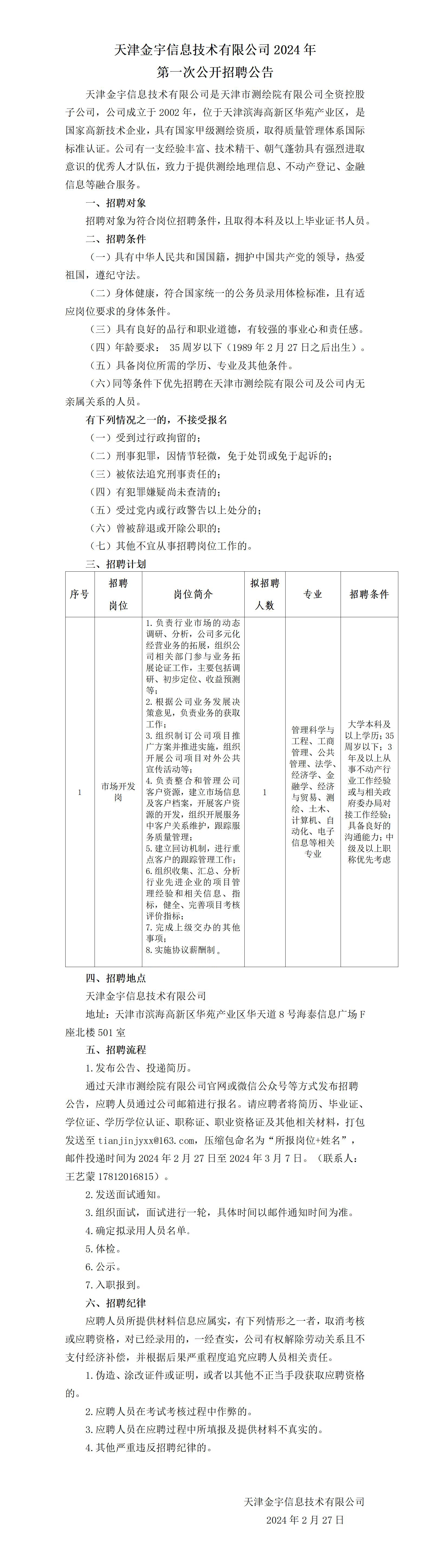 天津金宇信息技術有限公司2024年第一次公開招聘公告 2024-02-27